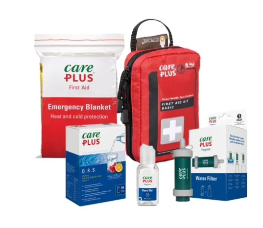 U vindt in dit noodpakket 1 verpakking Care Plus® O.R.S. Oral Rehydration Salt (10 sachets) om uitdroging door warmte, inspanning of ziekte te voorkomen. Voor veilig drinkwater is er de CP® Water Filter – Jungle Green (1 stuks), een multifunctioneel waterfiltratiesysteem dat tot 3.500 liter water kan zuiveren. Voor hygiëne onderweg bevat het pakket 1 flesje CP® Hygiene Gel (100 ml). Voor medische zorg is er de Care Plus® First Aid Kit Basic (1 stuks), een compacte EHBO-set met 28 onderdelen. Tot slot bevat het pakket de Care Plus® Emergency Blanket (1 stuks), een reddingsdeken die beschermt tegen kou of hitte en in veel noodsituaties onmisbaar is.